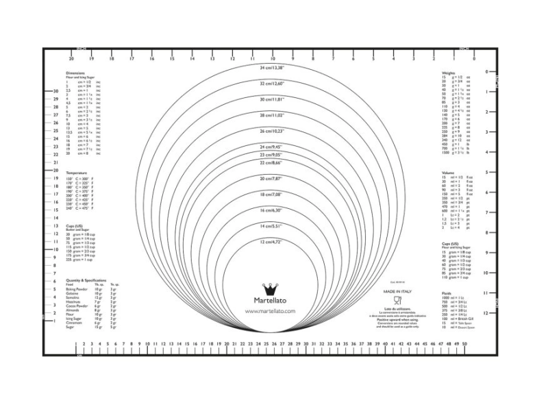 Profesionální cukrářská podložka s měřítkem, rozměry 60 × 40 cm, plastová, protiskluzová úprava, vyznačené čtverce a kruhy.