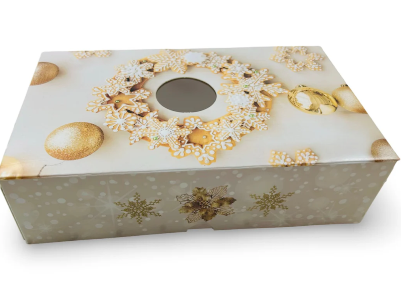 Krabička disponuje průhledným okénkem pro atraktivní prezentaci vašich vánočních cukroví, pralinek, cupcaků, donutů nebo kosmetických a keramických dárků.
